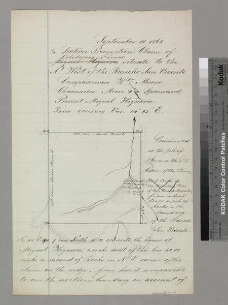 NW of the Rancho San Vicente: "Preemption Claim," with hachures, stations, landmarks, structure, courses, distances . Title supplied by cataloger.