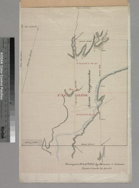 Featuring vegetation, hachures, structures, High Ridge of Mountains, crops/fields; courses, distances, stations, boundary markers, section & township numbers. Alt. title supplied by cataloger.