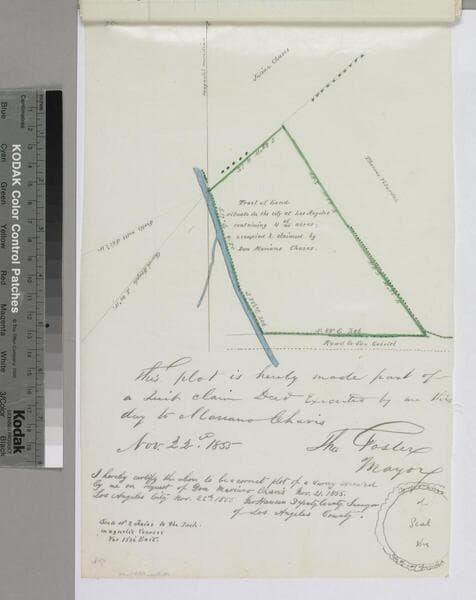 North side of road to San Gabriel, now (owned by) Wilhard. Other parcel owners: Velardez, Charos,. Zanja in blue; bearings, distances. Verified by Tho. Foster, Mayor. Verso: Mariano Chavis now Wilhard. Alt title supplied by cataloger.