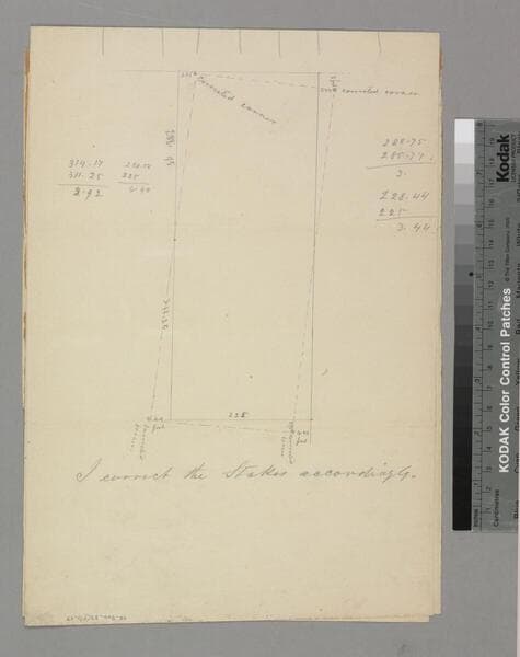 P. 7 of stapled document, "Survey of the American Cemetery... on request of [P.] Beaudry..." Lot 8, Bl. 37 detail with acreage, courses, distances; also loose sketch map on P. Beaudry stationery shows lots above Moore street, with owners' names [also unidentified sketch on verso]. Title supplied by cataloger.