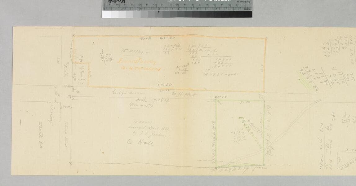 Bound within document: 1884-1885, Tract South of German Colony North of Wilmington, p. 11; west of Wilmington Avenue, showing parcel owners, acreage, distances; color highlighting; pencil calculations. Title supplied by cataloger.
