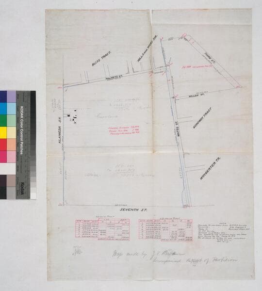 Showing Shafer parcels outlined in color, bordered by Seventh, Alameda, Mateo & Palmeto streets, Bliss Tract, Mill & Wicks subdivision, Goodwin & Wingerter tract; with courses, distances, acreage. Alt. title supplied by cataloger.