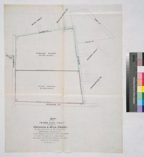 Grouped with "Rising Sun Vineyard division..." Tracts bordered by Alameda, Seventh, Mateo, Third & Palmeto streets showing courses, distances, stations, acreage, structures, parcel owners: Wingerter, Bliss & Woodwintracts; Mills and Wicks subdivision; tables of boundary data for 73 Acre Tract and 23 Acre Tract and survey notes. Title supplied by cataloger.