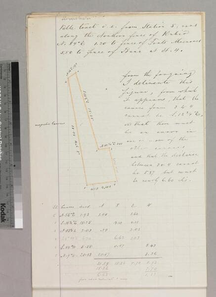 Verso of p. 9 [10] of fastened document, "Lorenzo v.d. Leck, April 30, 1879..." showing Kiefer, Coronel, Rubio parcels off Chaparral Str., with courses, distances. Title supplied by cataloger.