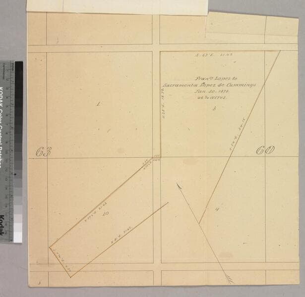 P. 3 [4] of attached document, Sacramenta Cummings Lopez Tract [tied to previous document]; showing courses, distances, acreage in Blocks 63, 60; orange highlighting. Alt. title supplied by cataloger.