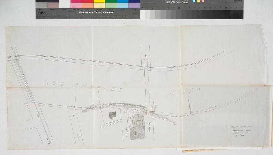 Also showing So. California Packing Co., covered bridge of Macy St. crossing Los Angeles River, structures and surface detail. Alt. title supplied by cataloger.