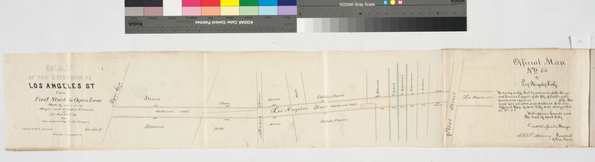 along Los Angeles St., showing parcel owners; courses & distances. Inset : sewer junction at Ogier Lane [Scale 1 : 20 ft.]. ["btween" misspelled in title]. Alt. title supplied by cataloger.