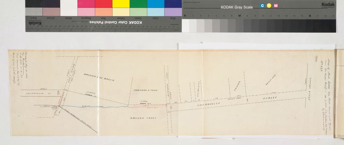 along Los Angeles St., showing parcel owners; field notes; courses & distances. Reference below title: Sept. 2, 1882 J.E. Jackson City Surveyor. Inset : sewer junction at Ogier Lane [Scale 1 : 20 ft.]. . Alt title supplied by cataloger.