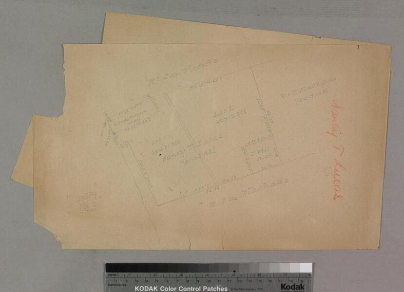Parcels north of Road from San Pedro to Los Angeles, showing courses, distances, acreage, neighboring parcel owners. Title supplied by cataloger.