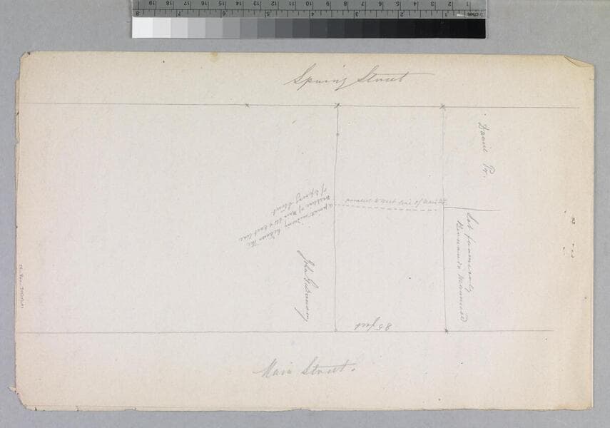 #1A: front side showing parcel owners along Main Street including Mansfield, Childs, south of 12th St. Sketch on verso in colored pencil showing courses, distances of wedge-shaped lot. Title supplied by cataloger.