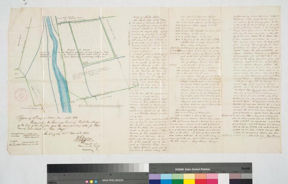 Dense hachures, zanjas, LA River; city lands; other parcel owners: R. Cararajaz [?], L. [?] Willhard; courses, distances, acreage. Alt. title supplied by cataloger.