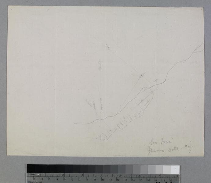 Within folded sheet, "Keller's Rising Sun Vineyard..." two sketches: one showing Feliz Gallardo & other parcel owners along Alameda street, one sketch of Rafael Gallardo parcel along Los Angeles river, showing distances in varas, other parcel owners; two sketches within "M. Keller... to Ch. Sarraute [?]..." pgs. 4-5 showing parcels & owners along Aliso St. below Alameda, with distances. Title supplied by cataloger.