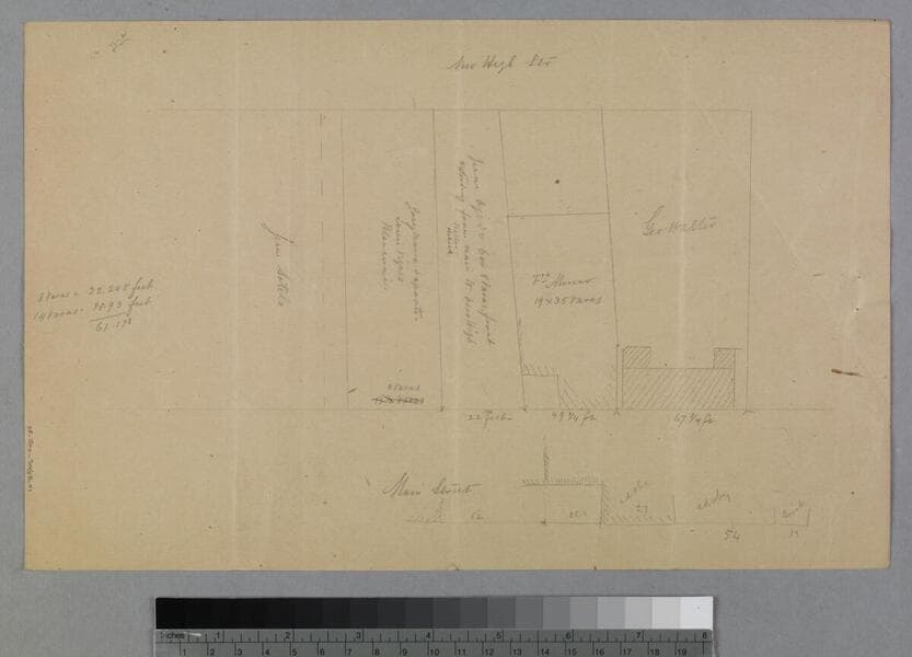 Lots & structures along Main Street east of Spring, between 1st & 2nd streets, showing parcel owners, acreage, dimensions. Title supplied by cataloger.