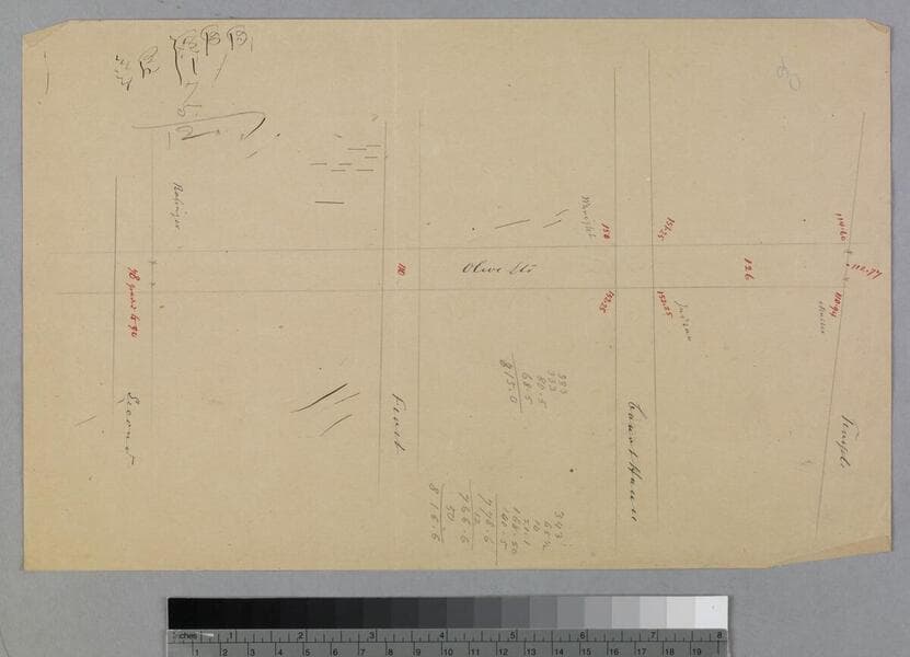 Parcel owners, distances, courses; pencil calculations; sketched additions to subdivision Verso: incomplete pencil drawing. Title supplied by cataloger.