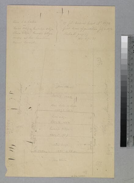 #1A: front side showing parcel owners along Main Street including Mansfield, Childs, south of 12th St. Sketch on verso in colored pencil showing courses, distances of wedge-shaped lot. Title supplied by cataloger.