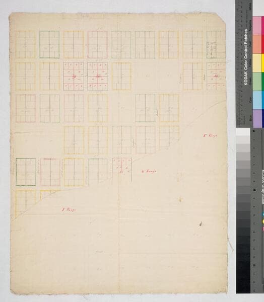 Rancho San Pedro. Water color highlights. Center section has the most detail with parcel owners, streets, some structures. Title supplied by cataloger.