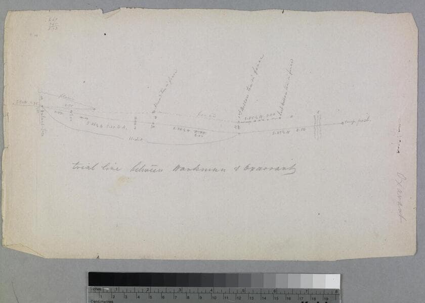 Showing courses & distances, stations, survey notes, structure, Moore's survey 29 January 1872. Title supplied by cataloger.
