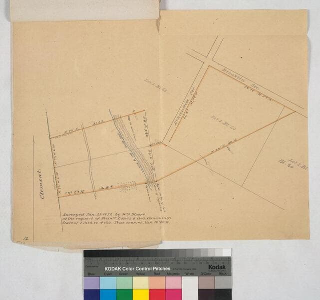 p. 12 of attached document, "Sacramenta Cummings Lopez Tract" [tied to previous document]; showing Lot 1, Bl 63, Lots 2-3, Bl. 60; structures, surface details, color highlighting, bordered by Clement, Echandia & Brooklyn streets. Title supplied by cataloger.