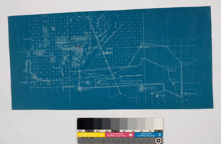 Sespe Ranch to the west. Showing oil fields and owners: Newhall Oil & Development, Union Oil. ; Notes in pencil on back. ; Parcels highlighted in yellow.. Title supplied by cataloger.