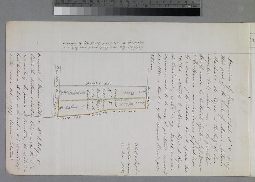 Verso of p. 10 of fastened document, "Miscellaneous Records Book No. 1 in the probate court..." showing courses, distances. Title supplied by cataloger.