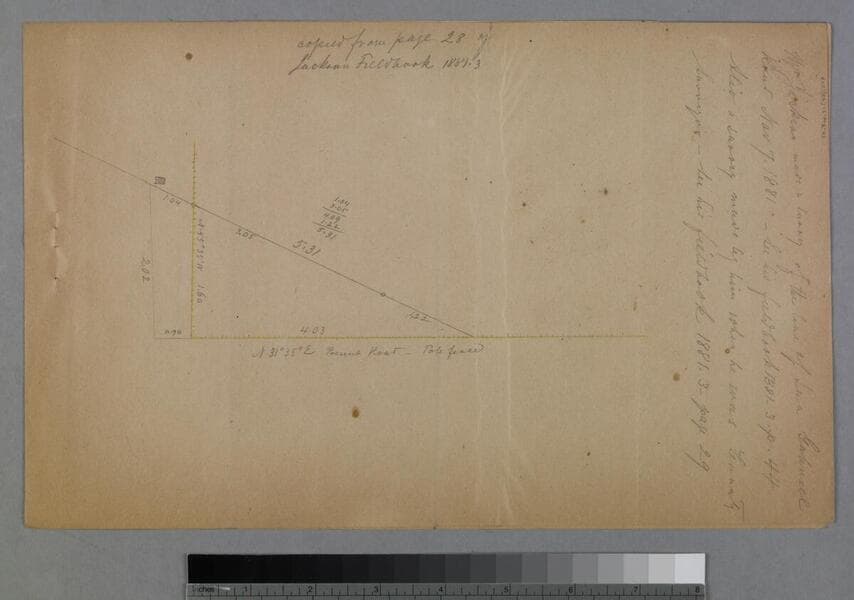 P. 8 [9] of pinned document, "Road to San Gabriel in front of the Ruiz tract..." showing structure, courses, distances, notations, calculations, table with data [same land as previous map]. Title supplied by cataloger.