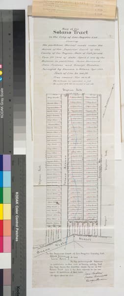 Being a subdivision of Lots 6, 7 and the East half of Lot 5, Block 46, and Lot 2, Block 45, Hancock's Survey of Donation Lots, along Effie St. south of Elysian Park, from Bishop to Solano Ave., Yorktown to Sampson St.. Pink & black ink, pencil notations, calculations; shows vegetation adjacent to Elysian Park to the north. Alt title supplied by cataloger.