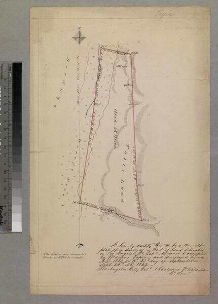 Showing LA River, showing courses & distances, acreage; drawn at the bottom of a document re: tract deeded to J.L. Brent from Julio Berdugo. Alt. title supplied by cataloger.