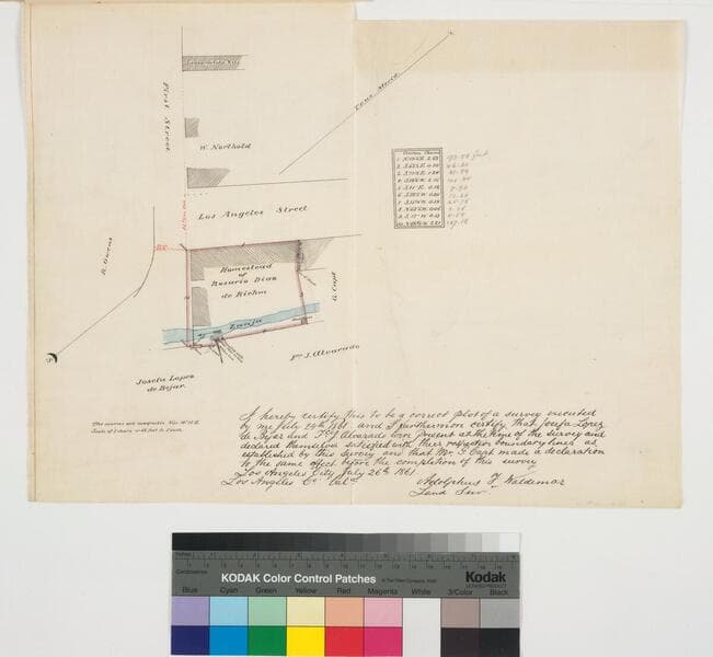 P. 6 of stapled document, "House lot of Antonio Valla..." showing Main, Los Angeles & San Pedro streets, courses, distances, parcel owners; red highlighting. Copied by Alfred Solano.. Alt title supplied by cataloger.