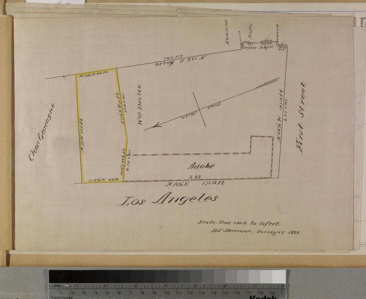 showing structures; hachures, color highlighting; courses, distances; House of Bisbee, adobe wall; S.W. boundary of lot described in a deed from the City of Los Angeles to Rosario Diaz de Riehm. Title supplied by cataloger.