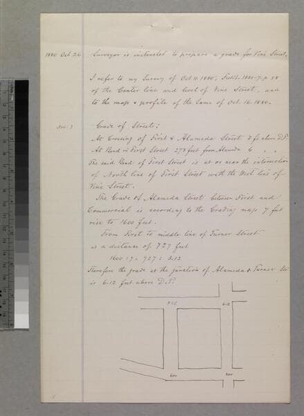 P. 2 of pinned document, "Vine Street Grade," outline of junction of Alameda & Turner streets, with measurements. Title supplied by cataloger.