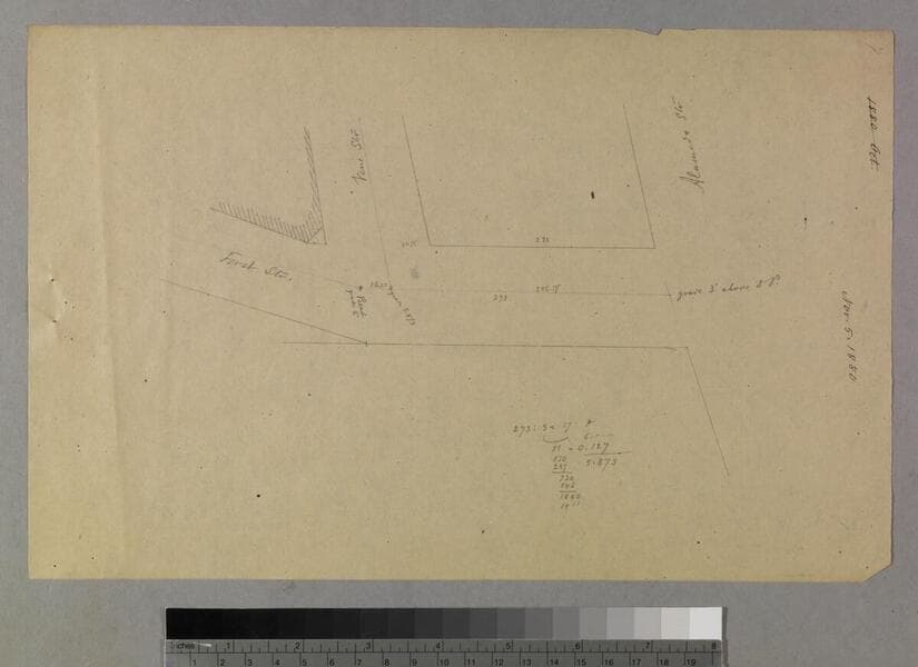 P. 4 [6] of pinned document, "Vine Street Grade," Block 3 Pryor Tract, between Vine & Alameda, Turner & 1st streets, showing courses, distances; covered in calculations Verso of previous page has crossed out sketch map. Title supplied by cataloger.