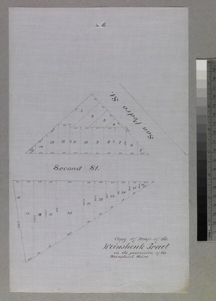 P. 3 of pinned document, "Wilmington Street Grade" from First to Commercial streets, showing courses, distances, parcel owners. Copy by Joseph A. Bernal. Alt title supplied by cataloger.
