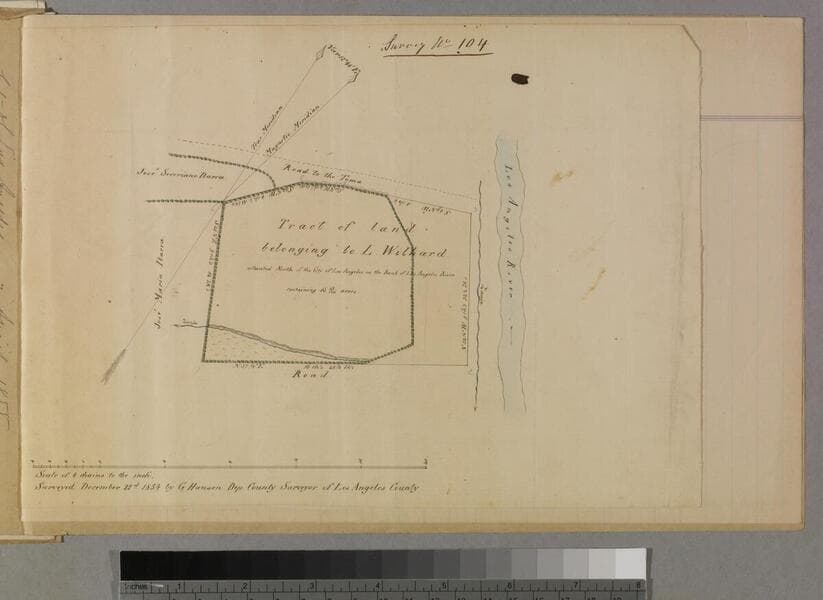 P. 5 of fastened document, "Luis Wilhart Tract," Survey No. 104: west of Los Angeles River, showing courses, distances, acreage, Road to Toma, adjacent parcel owners. Title supplied by cataloger.