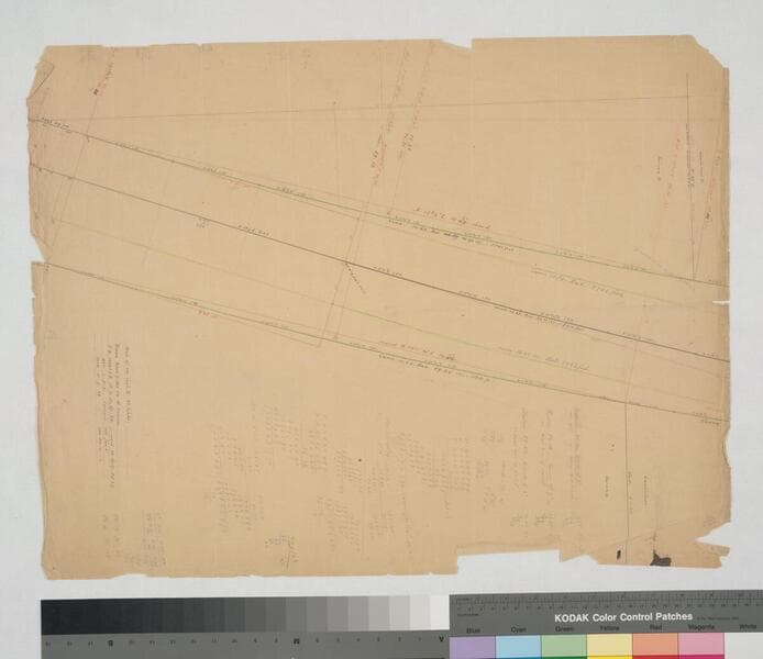 Title history: 1866-1885. Bearings, distances, color highlighting, parcel owners indicated; pencil calculations. Title supplied by cataloger.