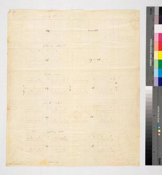 Numbered lots, some owners, Fourth to Eighth St., Main to Grasshopper St.. Verso: Ords Survey, House lots betw. 4th & 6th Street. Red & black ink. Alt title supplied by cataloger.