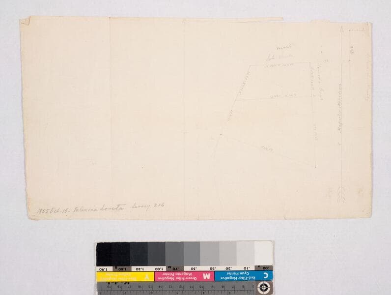 Survey No. 216; structures, list of deed transfers; color highlighting, parcel owners, structures; bearings, distances. Verso: outline sketch. Los Angeles City, Alameda Street: 4 x 4 in. (on sheet 7 3/4 x 13 1/2 in.) sketch of part of larger map. Title supplied by cataloger.