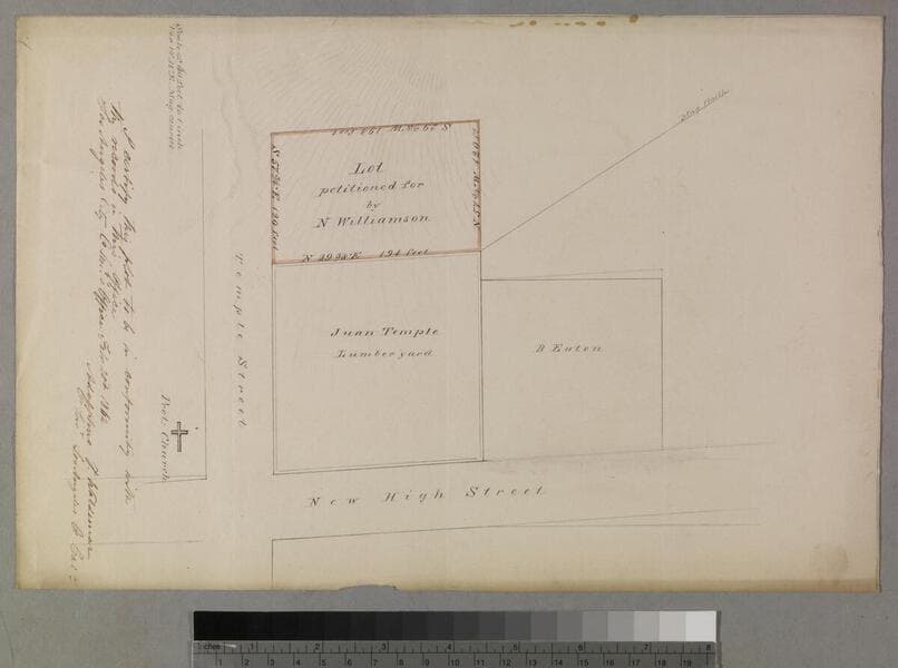 Pg. 8 of document, "Survey of Subdivision of the Eaton Lots..." between Buena Vista & New High Streets, at Temple St., showing courses, distances, structures, parcel owners along New High St.. Alt. title supplied by cataloger.
