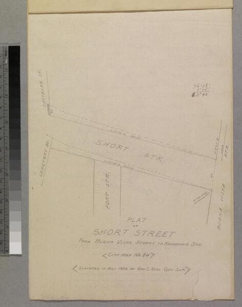 Castelar to Buena Vista St., Bellevue Ave. (Short St.) to Sand St., showing structures, lot owners, with notes; courses, distances, survey history. Paper watermark: Southworth’s 1882 Linen Bank. Alt title supplied by cataloger.