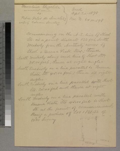 P. 4 of stapled document, "Louis Sentous & Bros..." [see City Archives Vol. 13 p. 338]; featuring lots G & I along Short St. between Castelar & Buena Vista streets; showing parcel owners: Coronel, Mascarel, Buelna, courses, distances. Alt title supplied by cataloger.