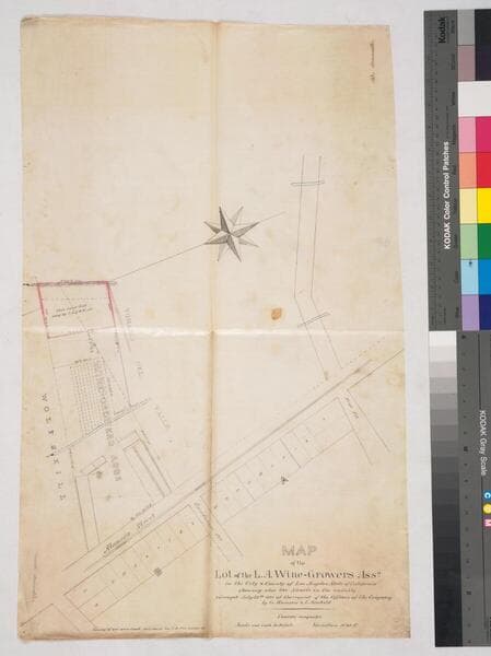 Alameda to Main; San Pedro St.; First St. to Third Sts.; showing structures, vegetation; parcel owners (Wolfskill), subdivision; color highlighting.