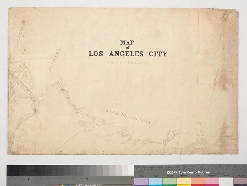Map of Los Angeles City [2 sheets showing northern half of Los Angeles and surrounding area, including Rancho los Felis and Rosa Castilla (rest of sheets missing), with structures and surface detail] [1 piece in 2 sheets]