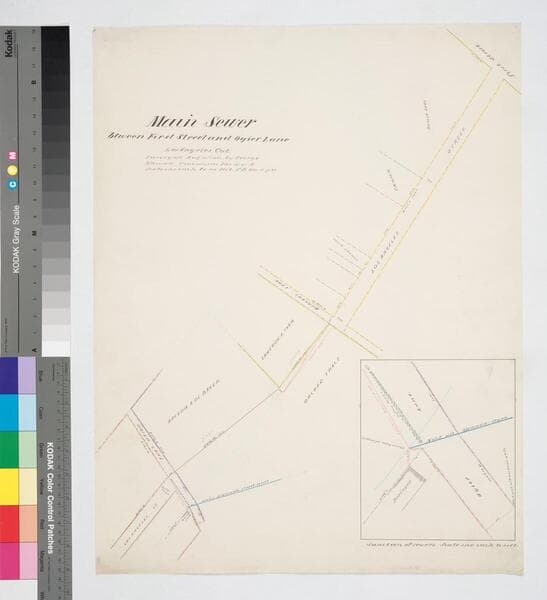 Main Sewer btween [sic] First Street and Ogier Lane [along Los Angeles St., showing names of parcel owners, with inset of sewer junction at Ogier Lane, field notes, and notes] [2 pieces, also including copy of preceding map]