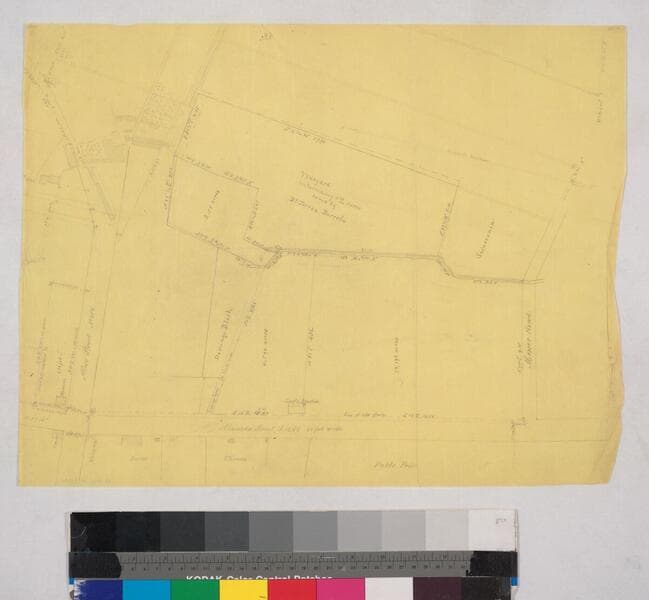 South from Mission St., including surface detail and parcel owners. Shows courses, distances, acreage; title histories; color highlighting. Surveyed at the request of J. W. Wolfskill. Title supplied by cataloger.