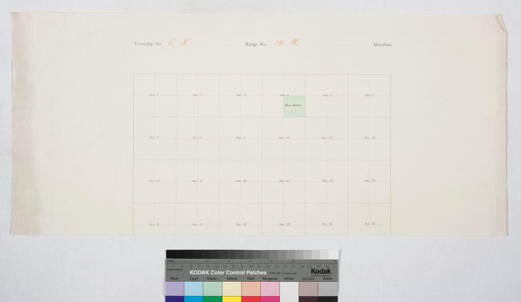 On printed township grid with names of parcel owners, in sec. 3-11, 20, 29, 31. Red & black ink. Notations on surveying history. Title supplied by cataloger.