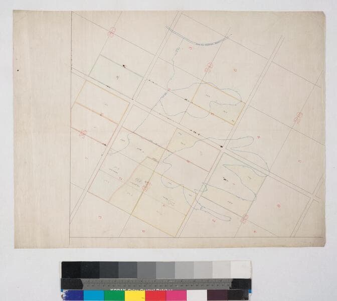 Blocks 58 & 59, Hancock's Survey. Outline of parcels in pencil, red and blue ink with one structure . [Paper watermark: Royal Linen Ledger]. Title supplied by cataloger.