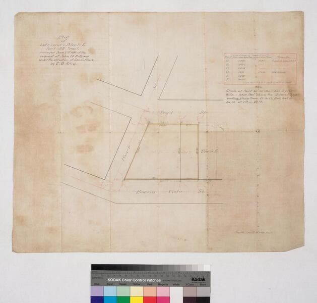 Buena Vista St., with corrections made Oct. 13, 1886, by George Hansen; color highlighting; courses, distances. Alt title supplied by cataloger.