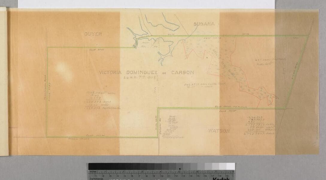 Within stapled document, "Victoria Dominguez de Carson, wife of Geo. Carson," after p. 62: showing courses, distances, acreage, color highlighting, parcel owners, surface detailing. Title supplied by cataloger.