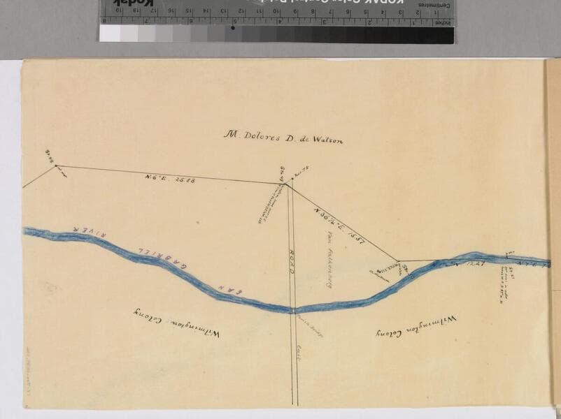 Wilmington Colony, Wilmington & Anaheim road All within stapled document, "To Maria Dolores Dominguez de Watson, widow of James Watson deceased..." showing courses, distances, stations; featuring San Gabriel river in blue; ink on tracing paper, surface details. Title supplied by cataloger.