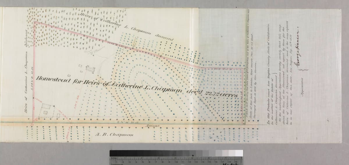 Bound within document, "In the Supreme Court of Los Angeles County... estate of Catherine L. Chapman..." p. 4 showing vegetation, structures ; courses, distances. Title supplied by cataloger.