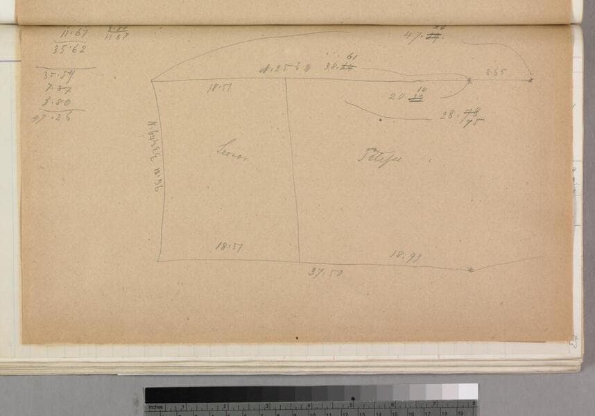 Bound volume: Rancho La Sierra, Partition 1876-1877. #16A: 8x13 sheet, pencil on paper; courses, distances, acreage; 16B: "Vicente Yorba" sketch map on 26 x 8 1/4 in sheet. Title supplied by cataloger.